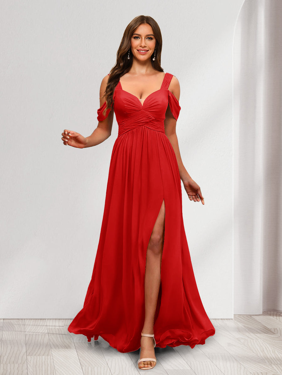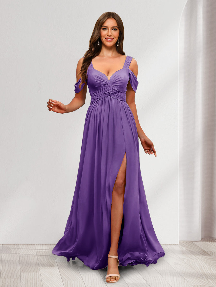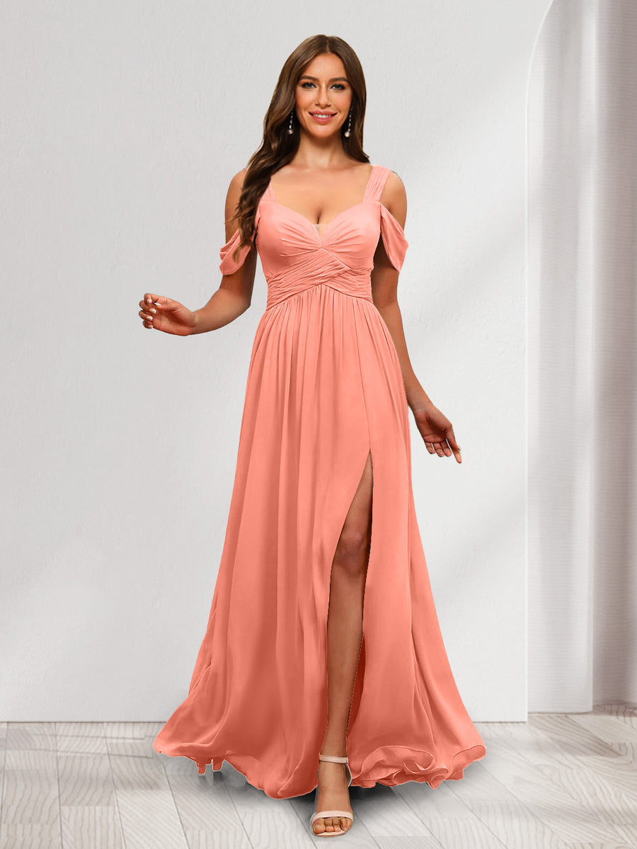 #Hanna 1001001 Robe de Demoiselled'Honneur Trapèze en Mousseline de Soie, Longueur au Sol, Fendue Sur le Côté, Épaules Dénudées