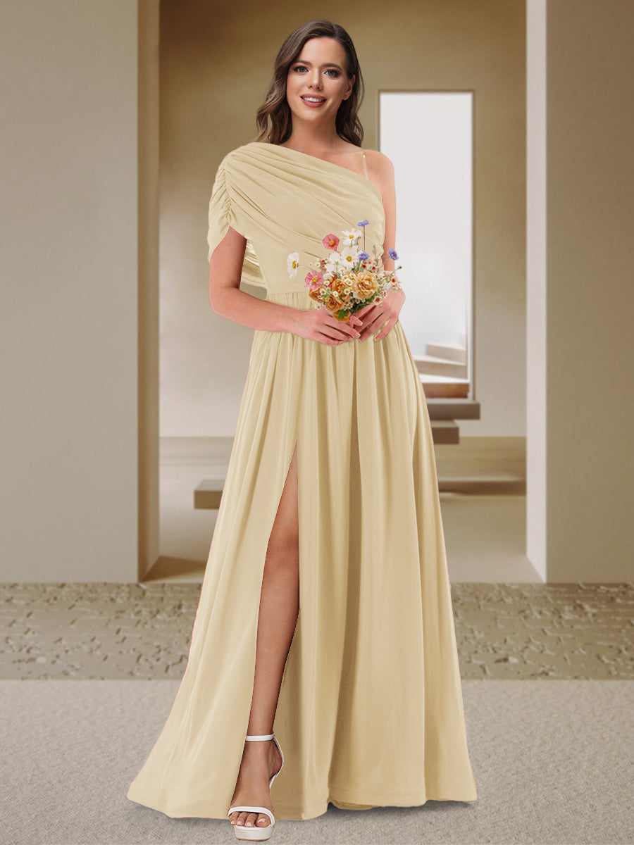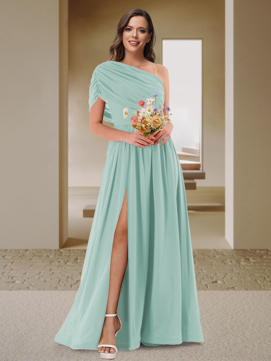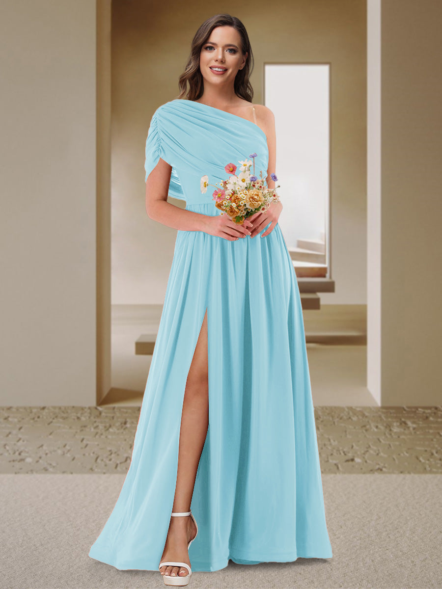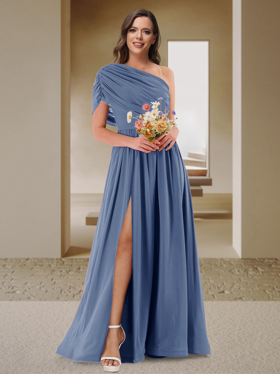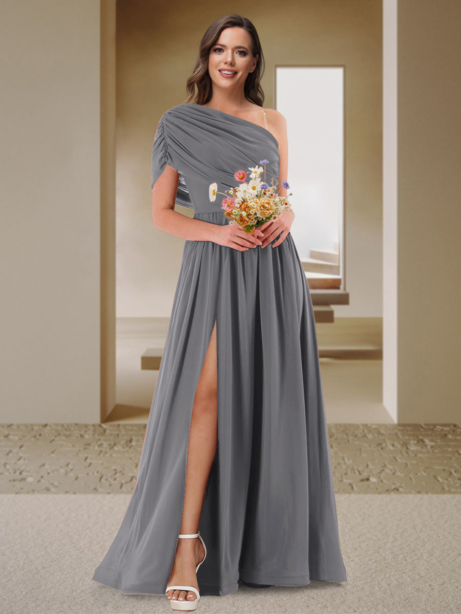 #Mikayla 11010049 Robe de Demoiselle d'Honneur En Satin Froncé à Une Épaule et Coupe Princesse avec Fente Latérale