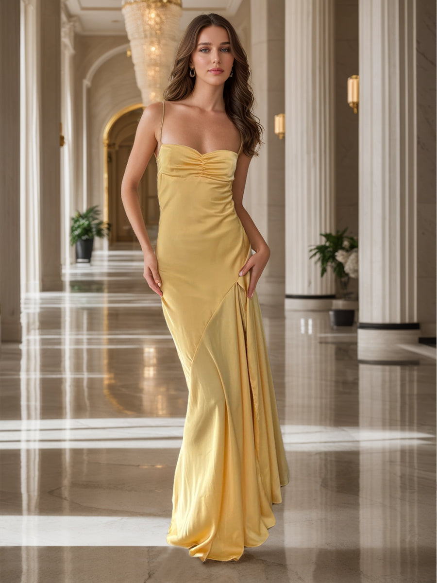#Belinda 12011063A1 Robes Longues de Soirée Style Fourreau/Colonne avec Bretelles Spaghetti et Plis, Fente Sur le Côté
