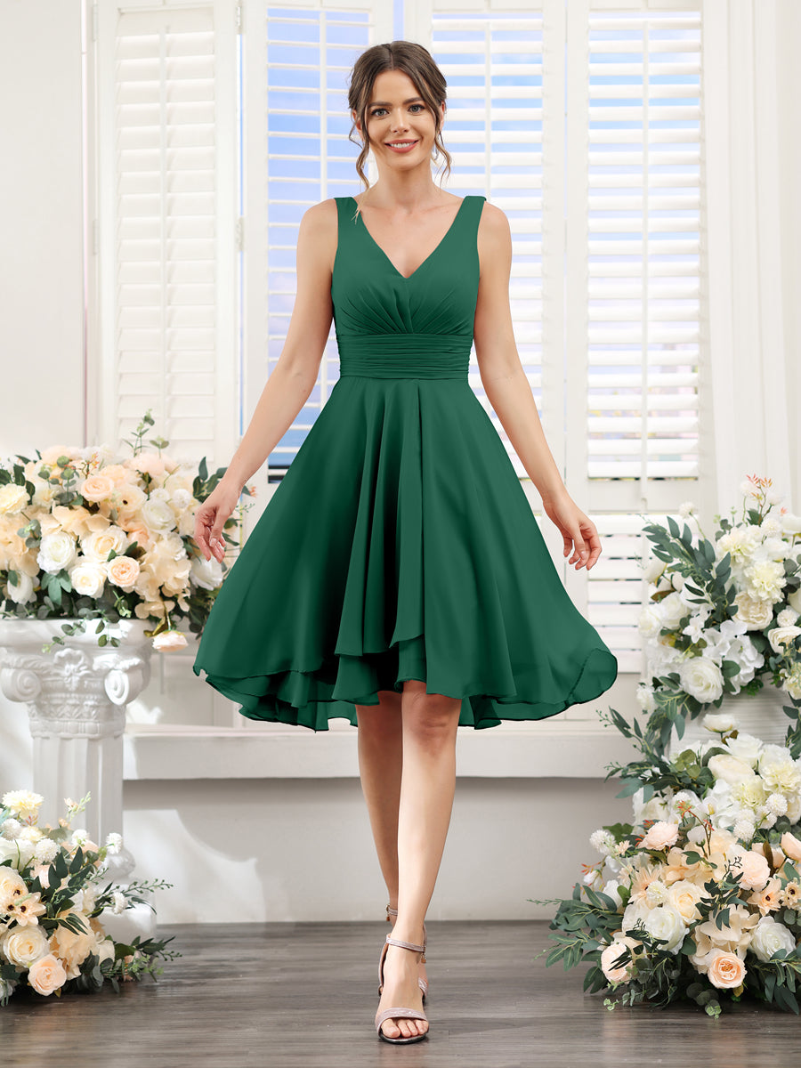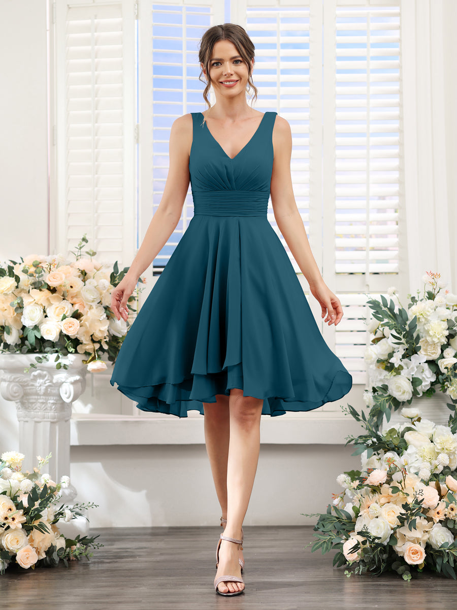 #Mia 9627038 A-ligne col en V froncé sans manches courtes robes de demoiselle d'honneur en mousseline de soie