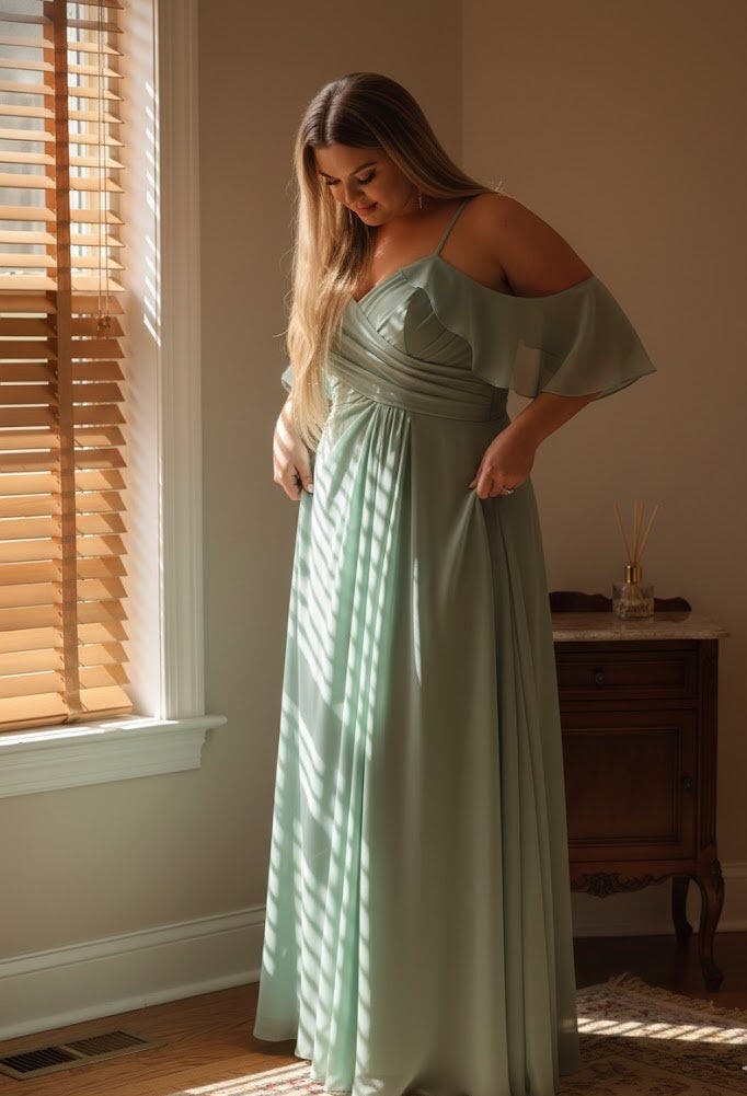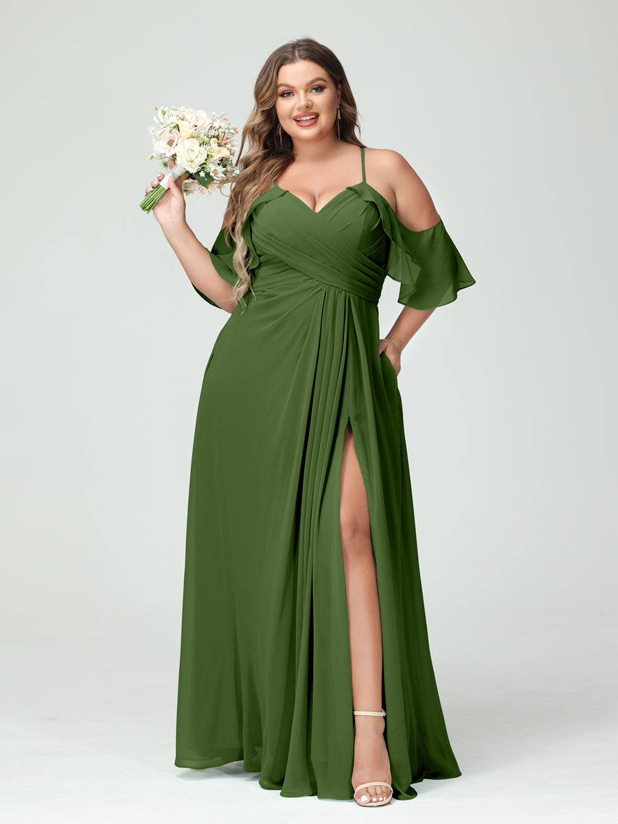 #Maggie 9658010 Forme Princesse Bretelles spaghetti Manches courtes Mousseline de soie Ruché Fendu sur le côté Grande taille Robes de demoiselle d'honneur avec poches