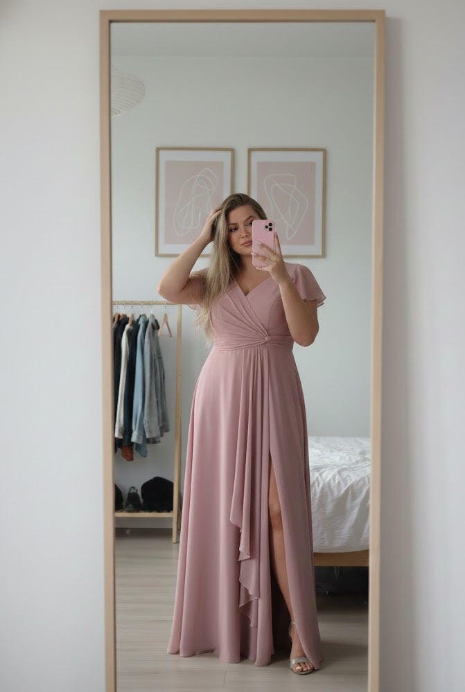 #Lena 9658011 Forme Princesse Col V Manches courtes Mousseline de soie Volants Fendue sur le côté Grande taille Robes de demoiselle d'honneur avec poches