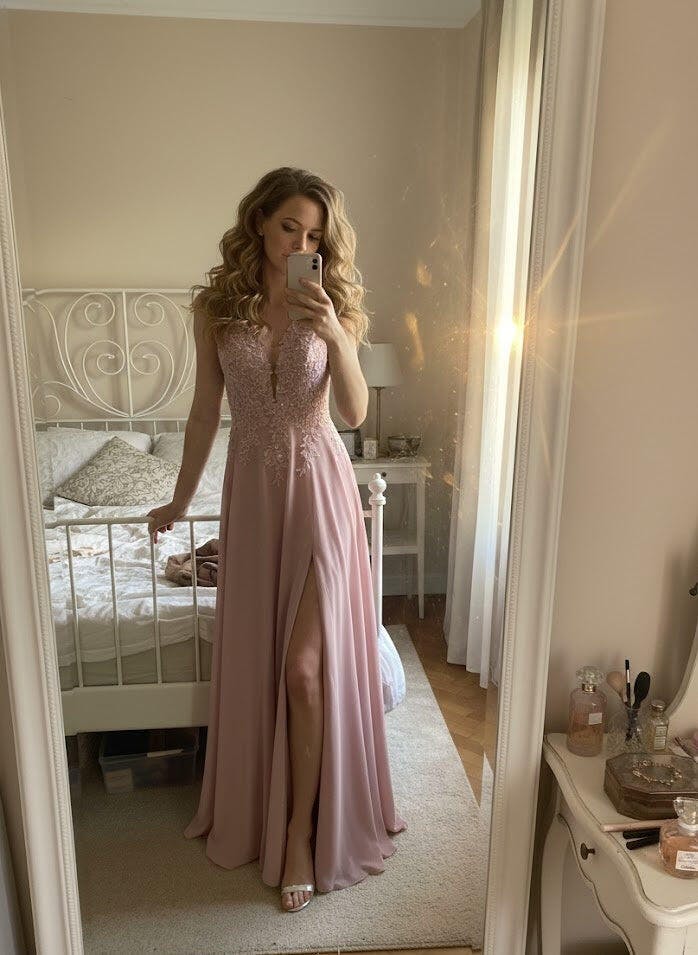 #Kennedy 9816208 Robe trapèze de demoiselle d'honneur longue en mousseline de soie, col en V, sans manches, avec appliques fendues sur le côté