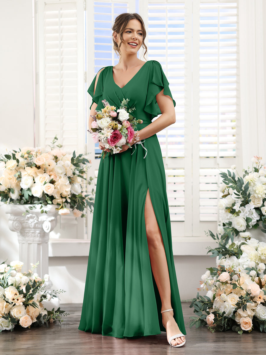 #Leah 9817005 A-ligne Col en V Manches Courtes Fendue sur le Côté Longueur Sol Mousseline Robes de Demoiselle d'Honneur