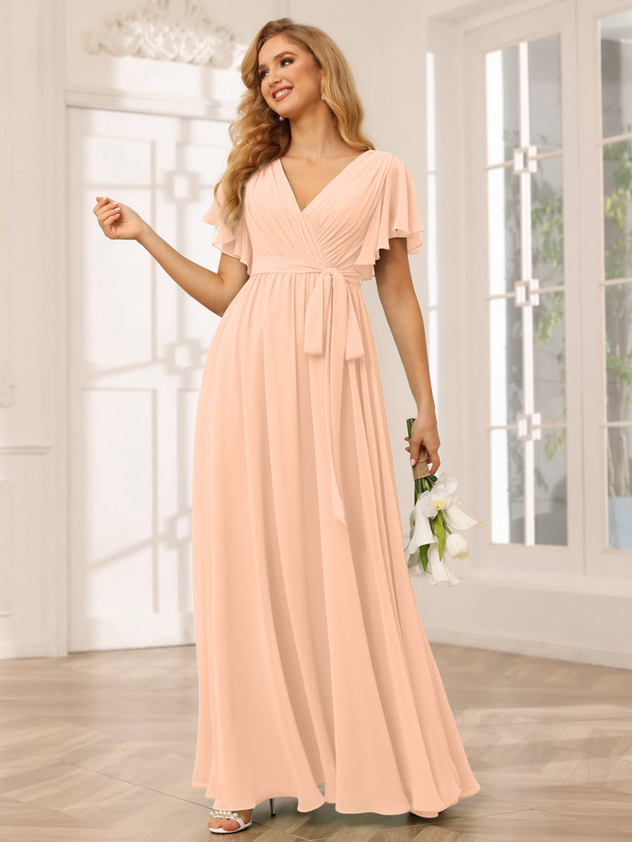 #Monica 9901291 Forme Princesse Col V Manches courtes Longue Robes de demoiselle d'honneur avec Ceinture