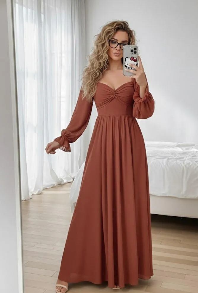 #Blakely C68101 Robe de Demoiselle d'Honneur En Mousseline de Soie à Manches Longues et Décolleté En Cœur de Forme A/Princesse avec Fente Sur Le Côté